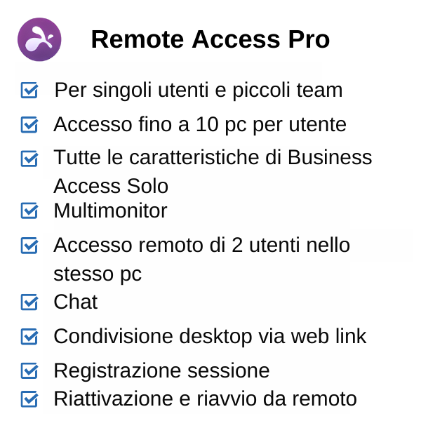 Accesso remoto facile, semplice e sicuro grazie ai migliori strumenti e funzionalità necessari ai professionisti ed alle aziende per poter essere altrettanto produttivi anche quando si lavora in remoto. Multiutente: 2 licenze utente consentono l'accesso condiviso a 20 computer. 3 licenze utente consentono l'accesso condiviso a 30 computer, ecc. Due utenti che eseguono la comunicazione remota in un computer richiedono due licenze Business Access Pro. Abbonamento 12, 24 o 36 mesi. Combinabile con i prodotti SOS+10 e SOS Unlimited