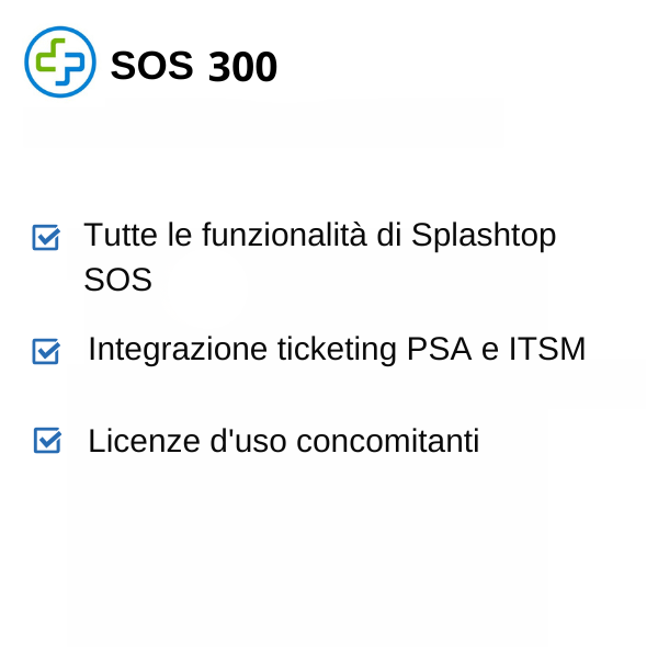 Splashtop SOS 300 possiede tutte le funzionalità di Splashtop SOS ed inoltre si integra con le principali soluzioni PSA ticketing e ITSM.